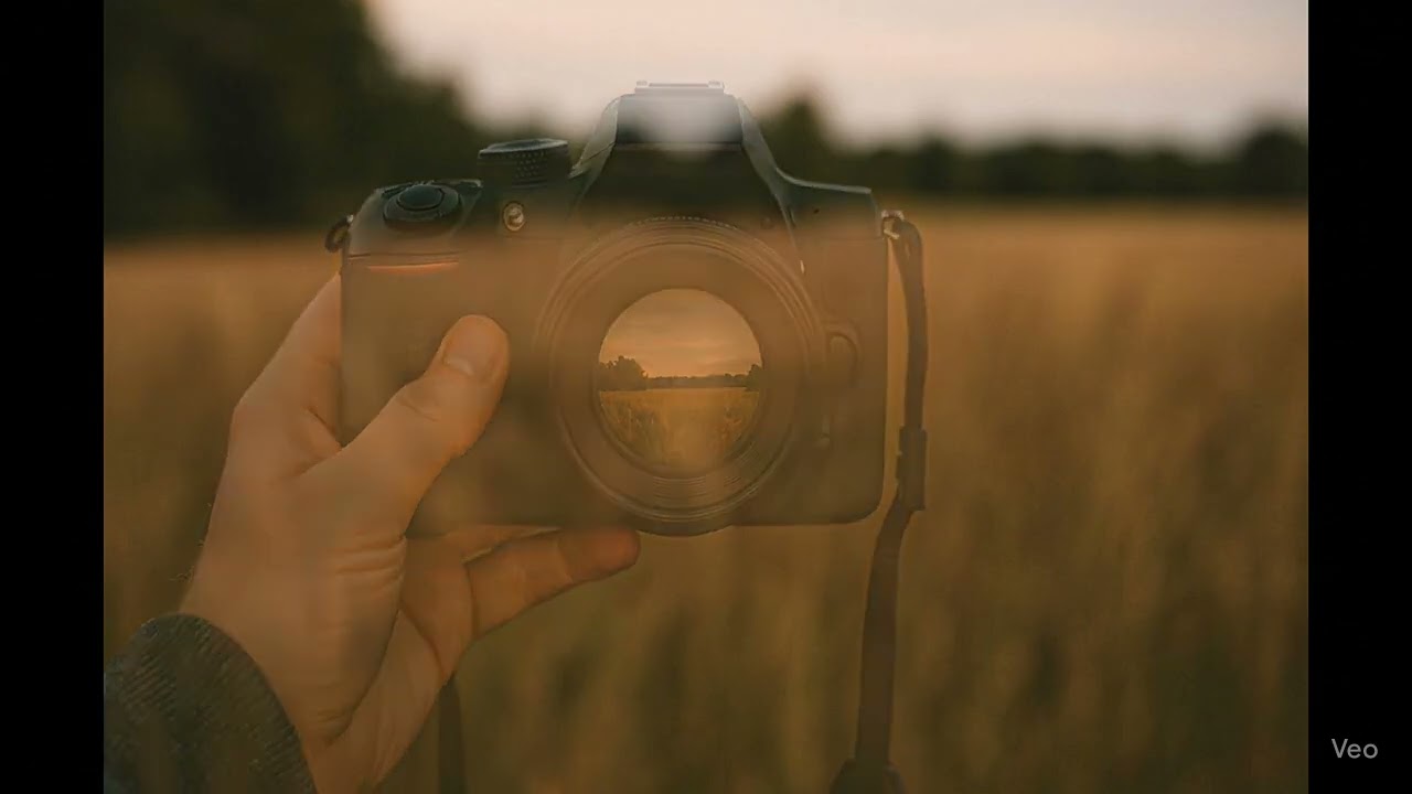 This short video takes us from a close-up, focused view through a camera’s viewfinder to a wide, expansive shot of a beautiful field at sunset. We see a person holding a DSLR camera, with the golden-hour landscape framed perfectly in its lens. The camera is then lowered, revealing the full, breathtaking scenery in all its glory. It’s a simple yet powerful transition that highlights the beauty of the moment.