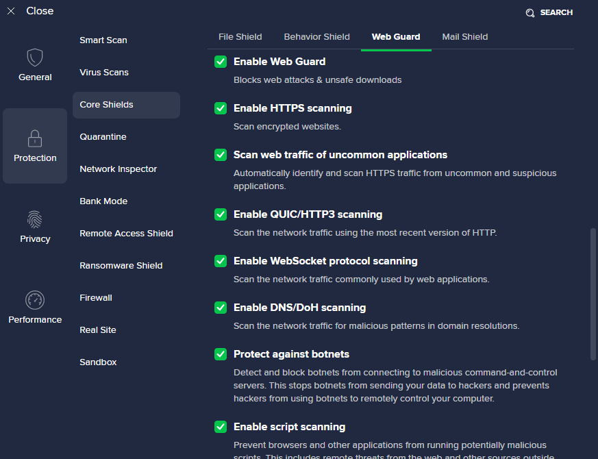 The web shield can be configured: certain elements such as “QUIC/HTTP3 scanning” can be disabled without completely disabling the shield.
