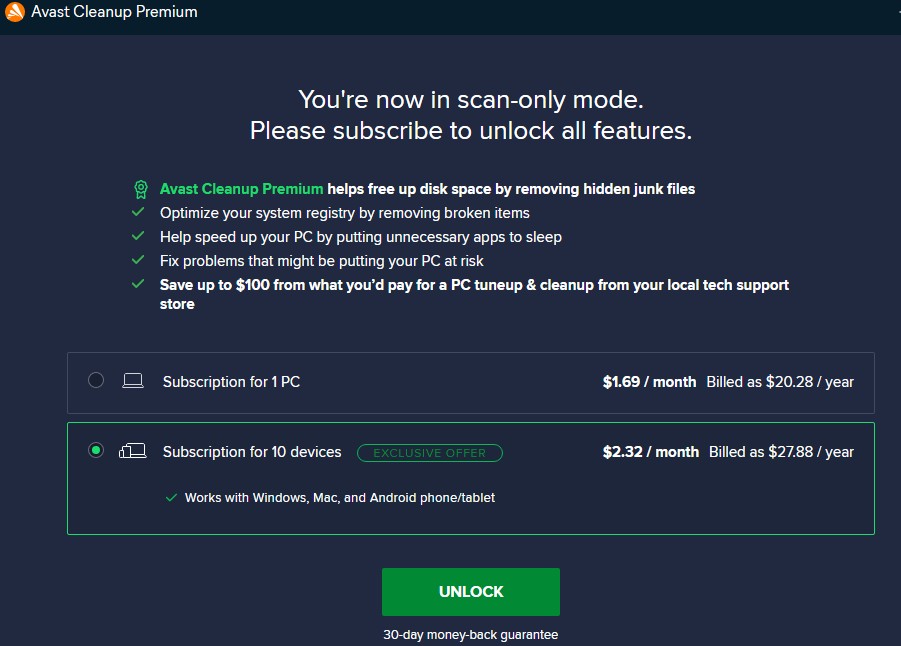 I tried using Cleanup (which is installed on my system and part of Avast Ultimate VIP which I paid for). When I click on the Disk Cleaner button “Clean Now” I get a popup that tells me I am in Scan Mode only…please cough up some more money to unlock these features (this is a recent happening, previously it worked without issue):