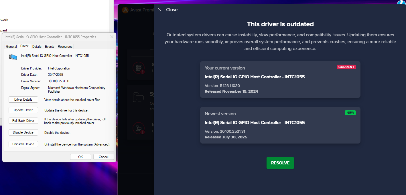 It’s been weeks after i updated driver: Intel(R) Serial IO GPIO Host Controller - INTC1055, but for some reason, whenever I run Avast Smart Scan, it keep detecting the driver as previous version(please refer screenshot)