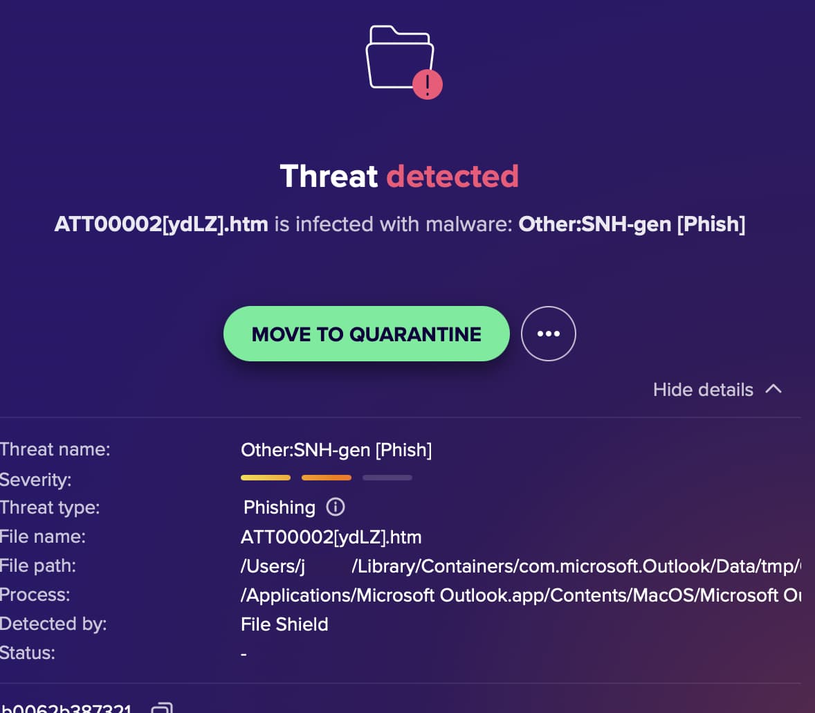 Avast notifies that it has found malware and requests to quarantine ATT00002…htm in Outlook for Mac. I ran two Avast scans and Avast found no problems, but Avast continues to display quarantine request message. Need advice on next steps: how can I determine if the threat is a false positive? Please share instructions on how to resolve. Thanks.
