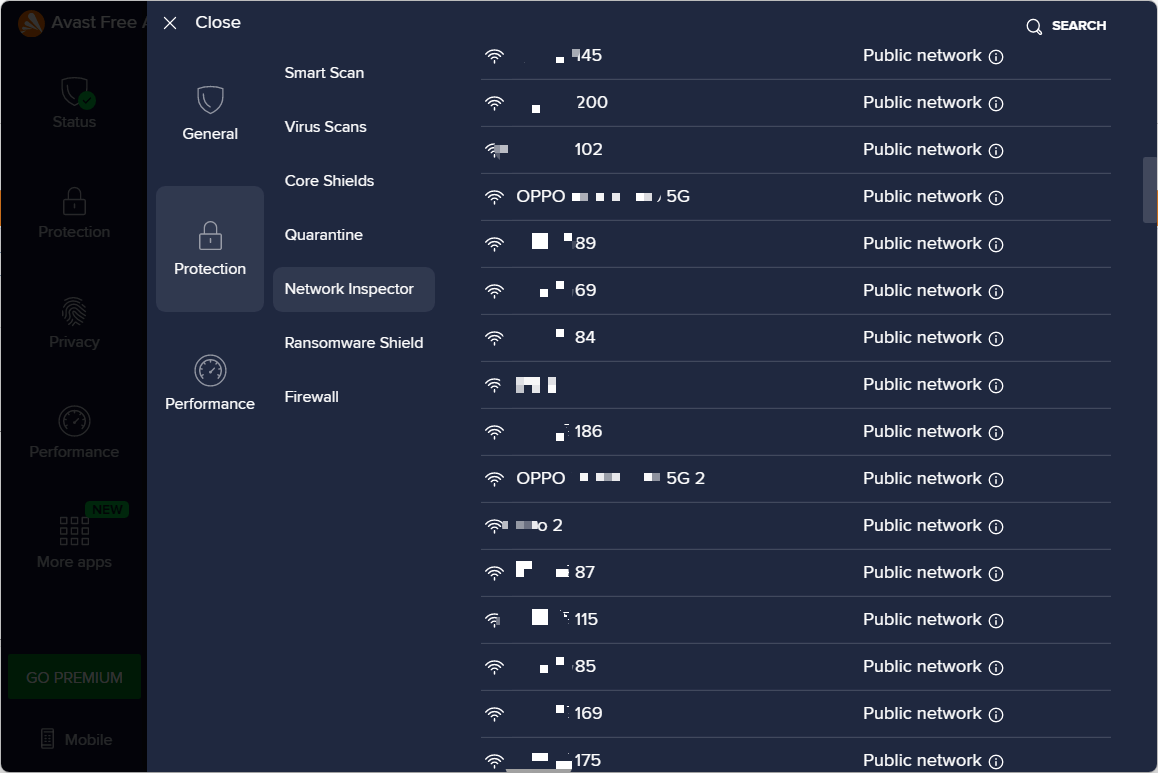 Avast UI > Menu > Settings > Protection > Network Inspector > List of monitored networks.