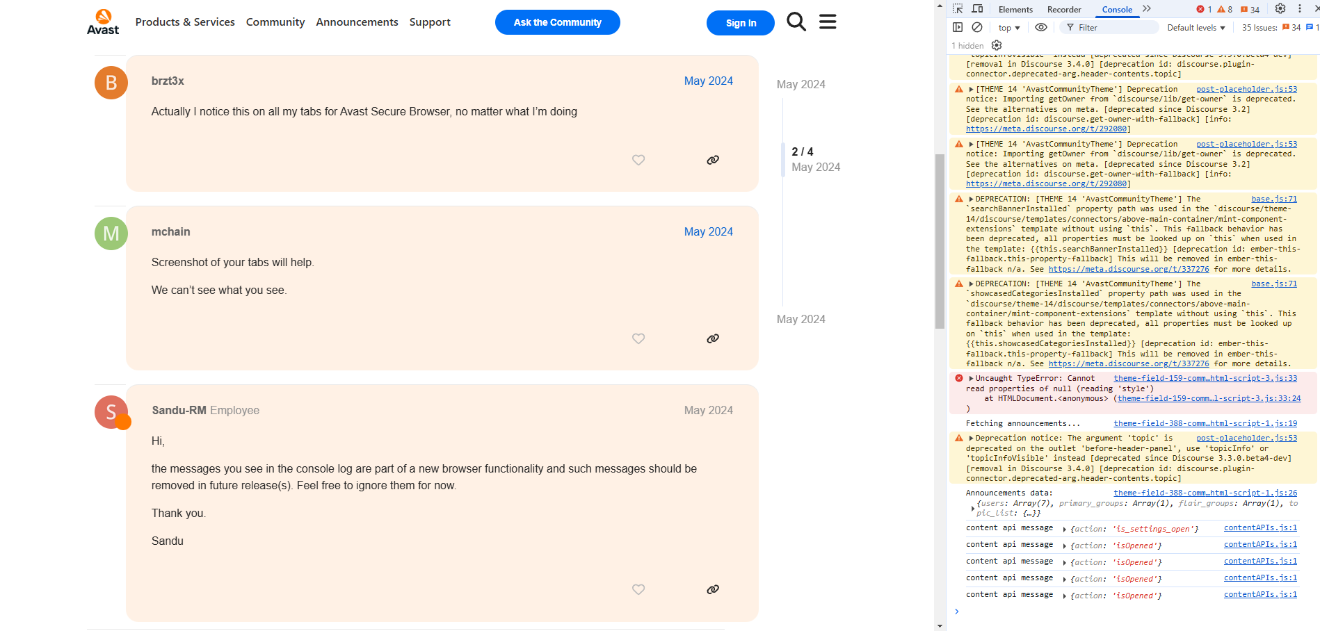 These console.log messages started to appear in my Avast browser’s console and I’m not sure why: