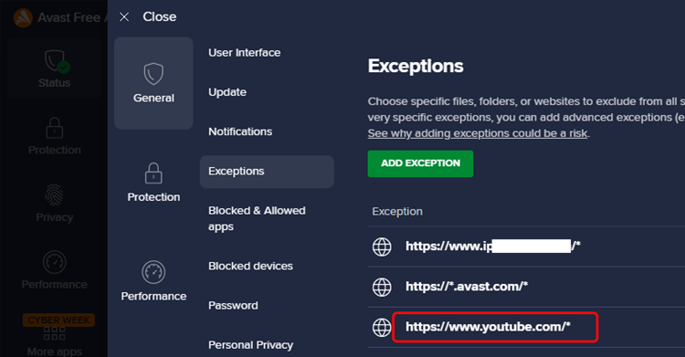 Avast UI - Settings > Menu > Exceptions - Add Exception, see attached.