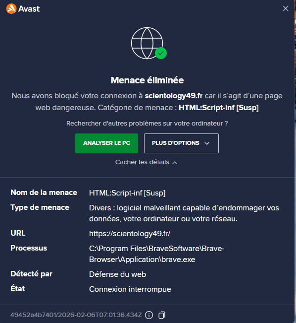 Signature History (HTML:Script-inf): Avast has recorded that scientology49.fr previously hosted a malicious script. Even though the script has been removed, the âInfected Domainâ entry remains in their Cloud database until a Time-to-Live (TTL) counter expires or a human validation clears it.