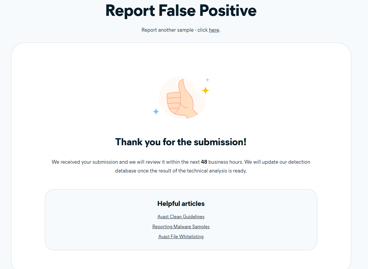 I also clicked several times on the False Positive button in avast itself and filled the indicated link www.avast[DOT]com/report-false-positive#pc to no avail.
