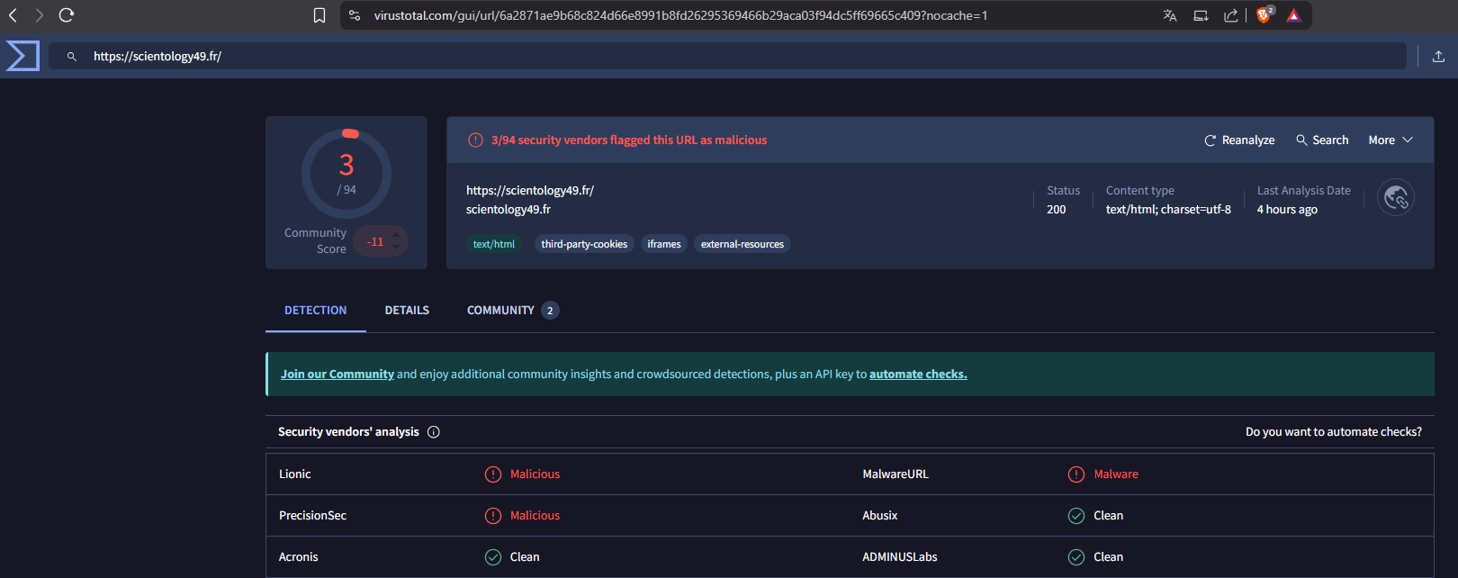 VirusTotal score is currently 12/97 because major engines are already clearing the domain. You can check the report on VirusTotal for scientology49 (DOT) fr