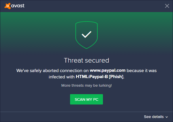 Running latest Avast update. “HTML:Paypal-B [Phish]” is not in the list here: https://www.avast.com/virus-update-history