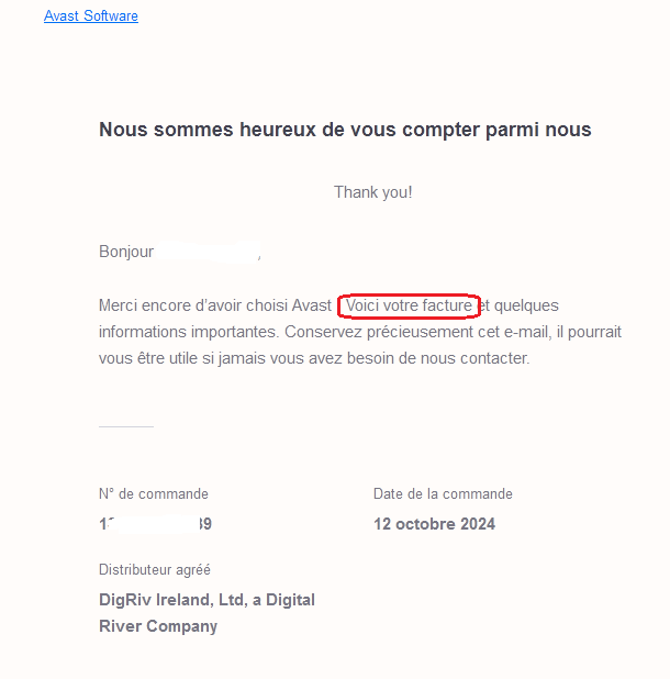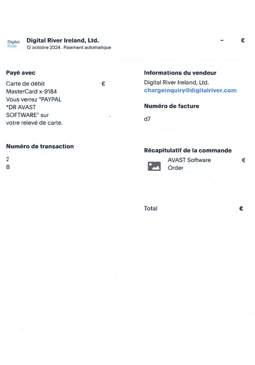 Là en ce qui me concerne c’est Digital River qui m’a vendu Avast, et sur les informations d’achat en octobre 2024, l’adresse de contact est celle de Digital River … Je suppose que c’est vers eux que je dois me tourner pour avoir la facture.Mais…