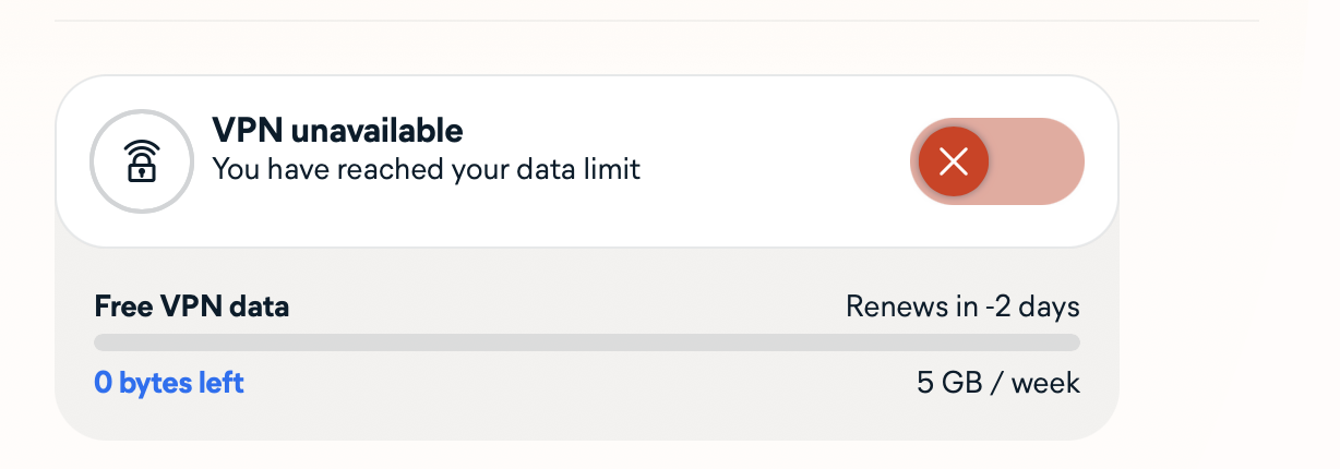 As the VPN function in the Avast One Free VPN component is restricted to 5GB per week as indicated in your screenshot.