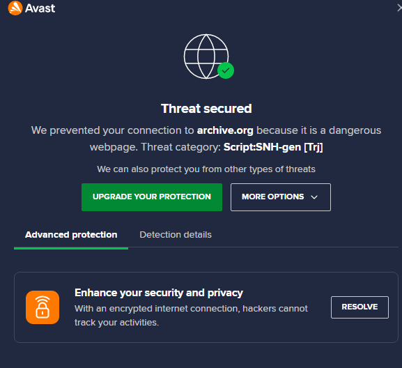 recently my Avast keeps popping up saying “Threat secured” from archive(dot)org saying its a dangerous webpage. I rarely visit that website and i didnt download anything from it (as far as i know, its a trusted website anyway). Im 99% sure its not a trojan or something but it’s just genuinely annoying and i want to fix it. Can anyone help me?