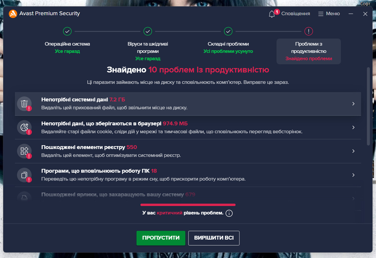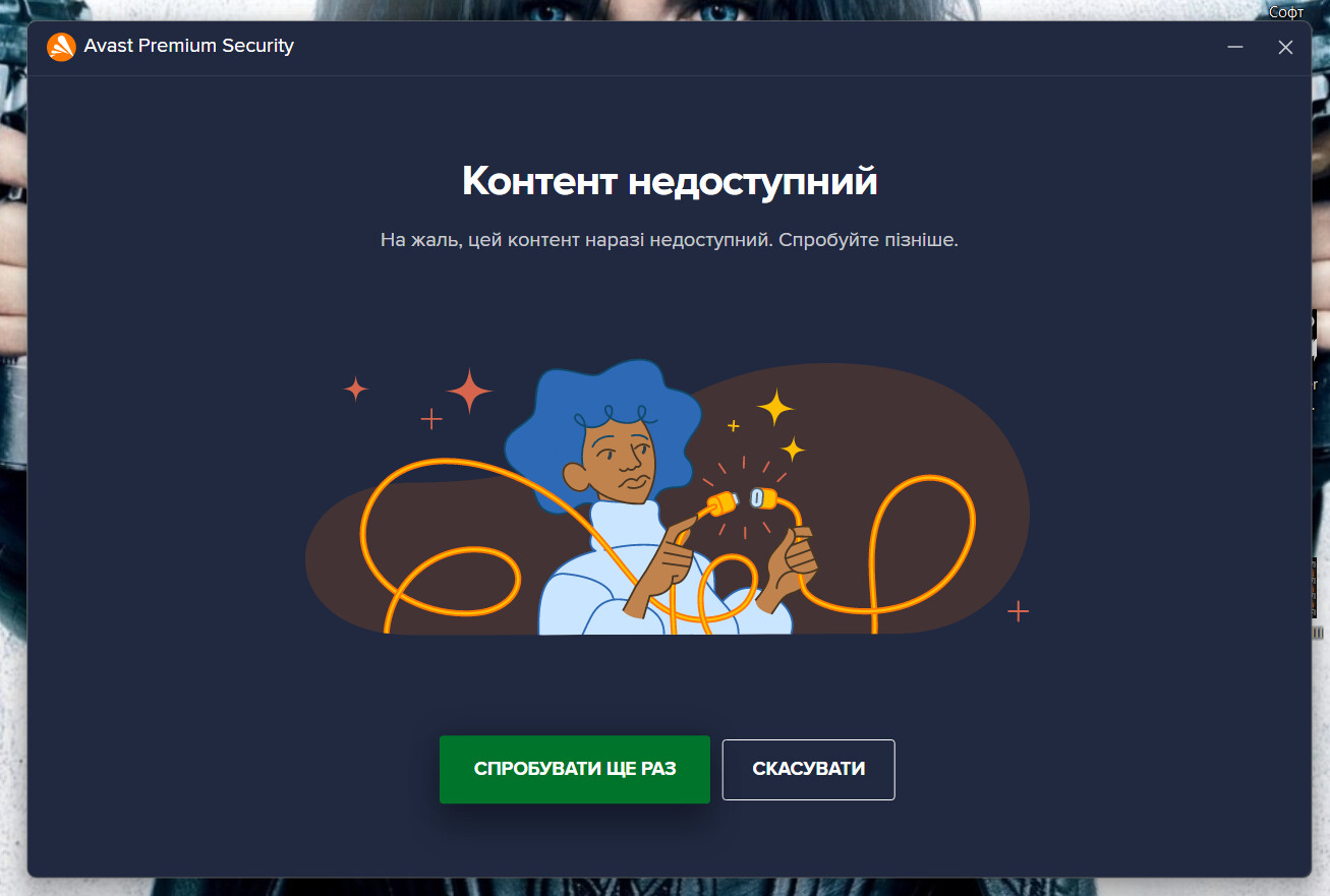 Після перевірки, антивірус пропонує вирішити знайдені проблеми. Перших 3 етапа він виконує добре, а після натискання кнопки на 4-ми етапі “Вирішити все“ вискакує вікно “Контент недоступний“. Стоіть оплачений Avast Premium Security