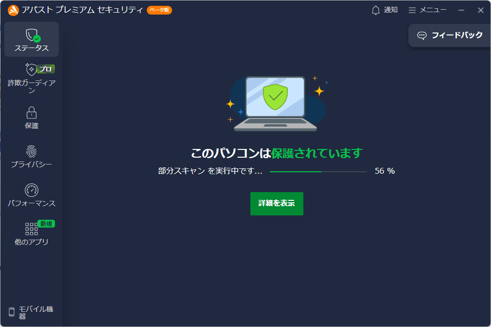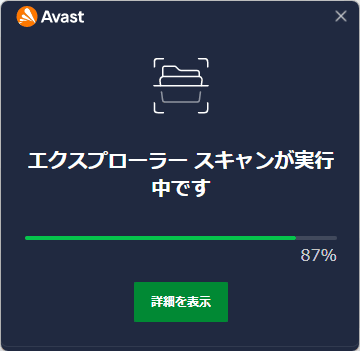 昨日(1日)の夕方に実行した際「進捗%が表示されてなかった」のでして…。あと「このパソコンは保護されています」の画面、PCを再起動するまで「スキャン中100%」となっていた次第です。