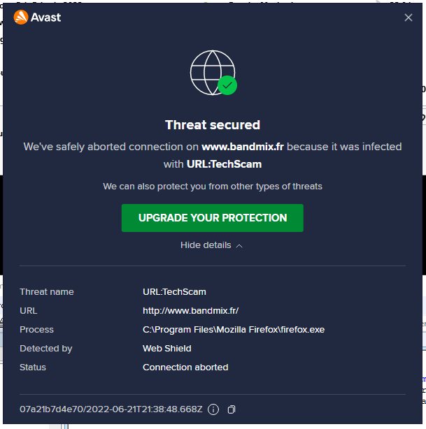 Avast is telling me that it is aborting connection to www.bandmix.fr because it was infected with URL:TechScam. This is a website that I have used regularly for some while - It is a high profile site (with partner sites in multiple countries and languages. So if it had been compromised, I am sure that it would have been sorted out quickly!